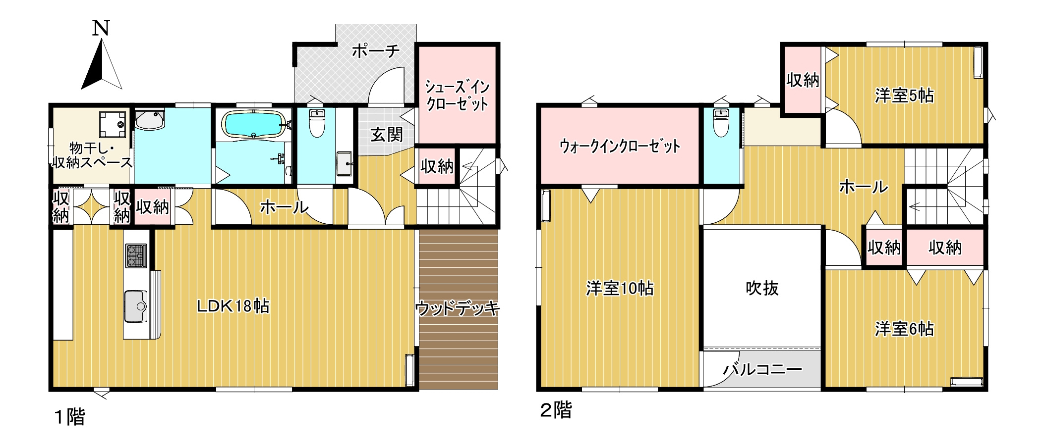 間取:3LDK(1階リビング18帖、ウッドデッキ、庭付き、2階洋室10帖、6帖、5帖)