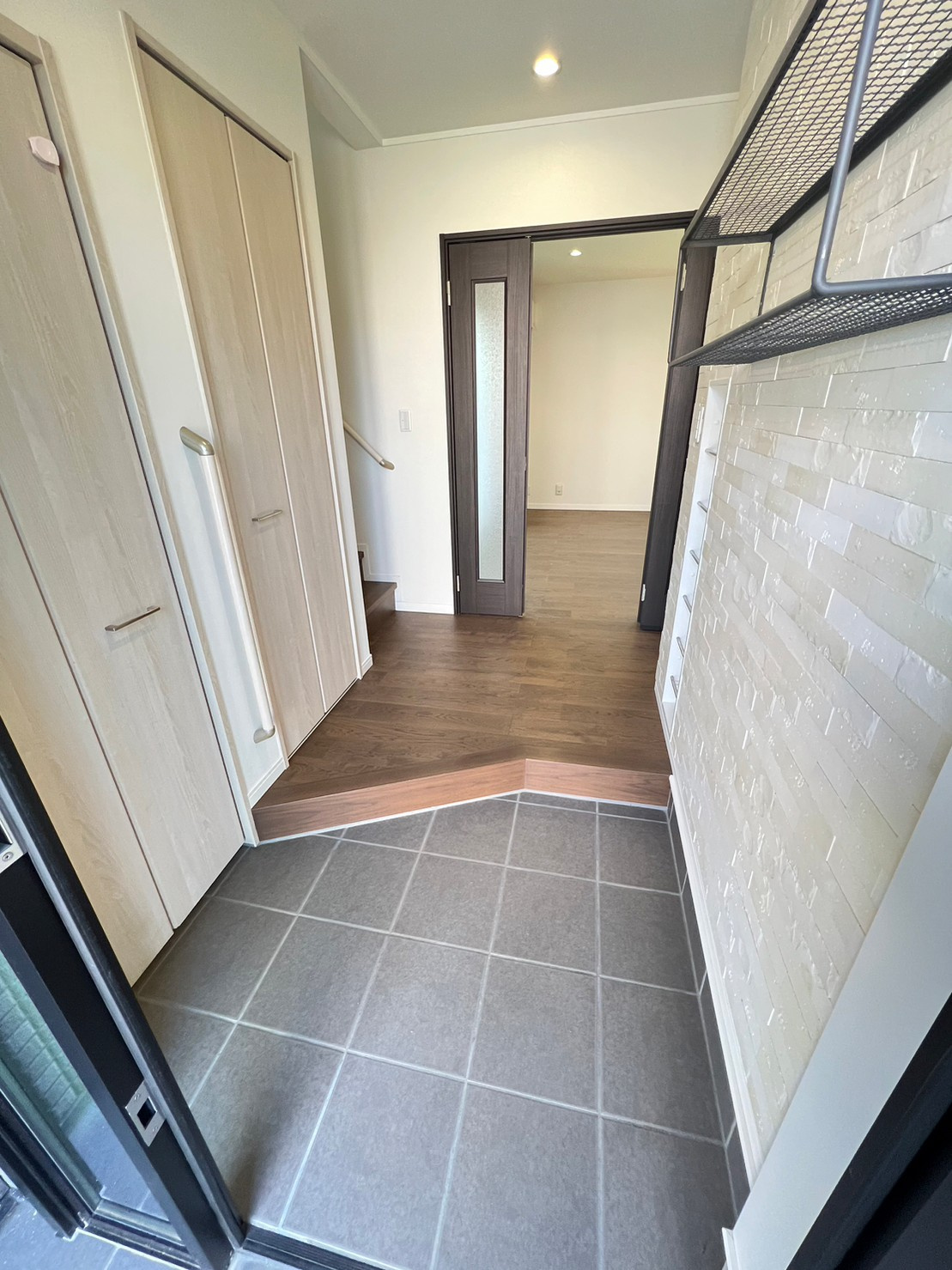 扉を開けた瞬間、オシャレな玄関と大きなシューズインクローゼットがあります