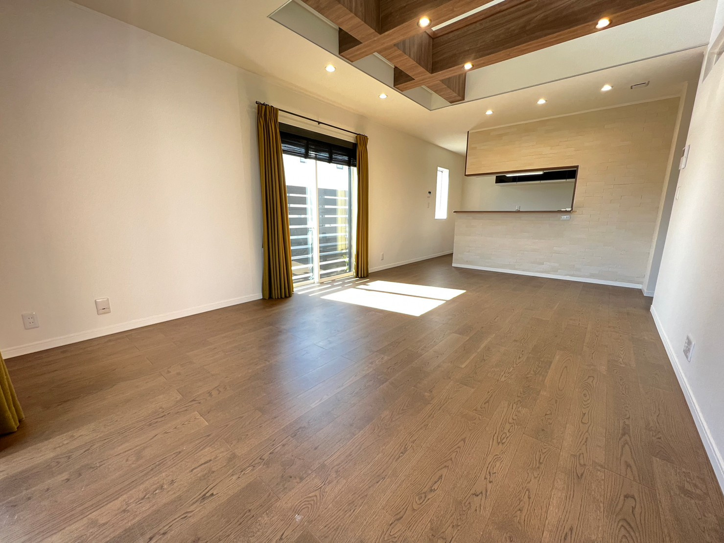 リビングは吹き抜け天井で開放的。ダウンライトでオシャレなリビングです。 ゆったり18帖ありますので、広さも申し分なし!