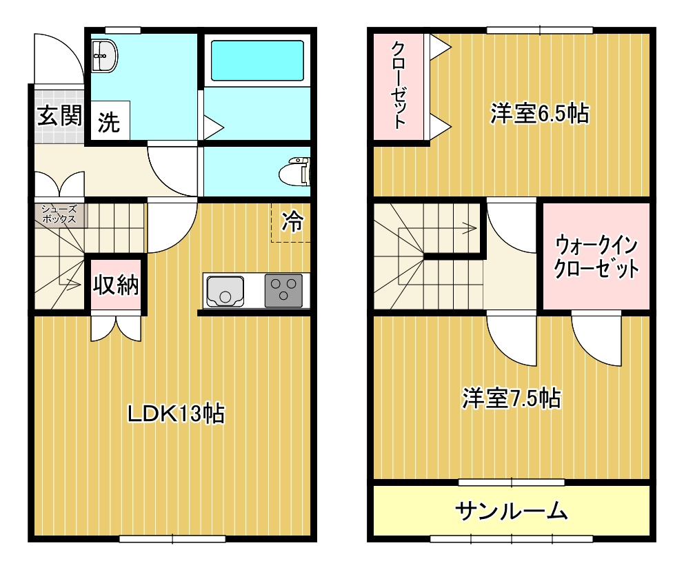 都市ガス、駐車場2台分込(内1台カーポート)、3口IHコンロ、システムキッチン、温水洗浄便座、追い焚き、独立洗面台、物干しスペース(サンルーム付)、TVインターホン、全室洋室、照明付き、メゾネット、ウォークインクローゼット